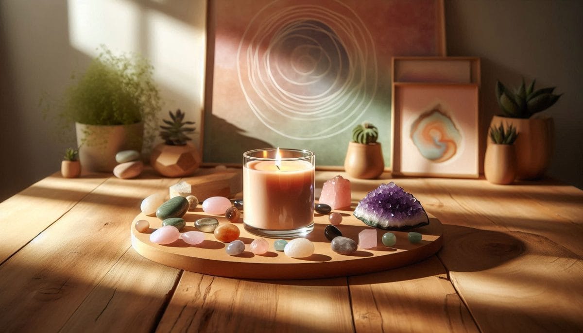 Bougies artisanales, pierres naturelles et objets spirituels choisis pour créer une atmosphère apaisante.